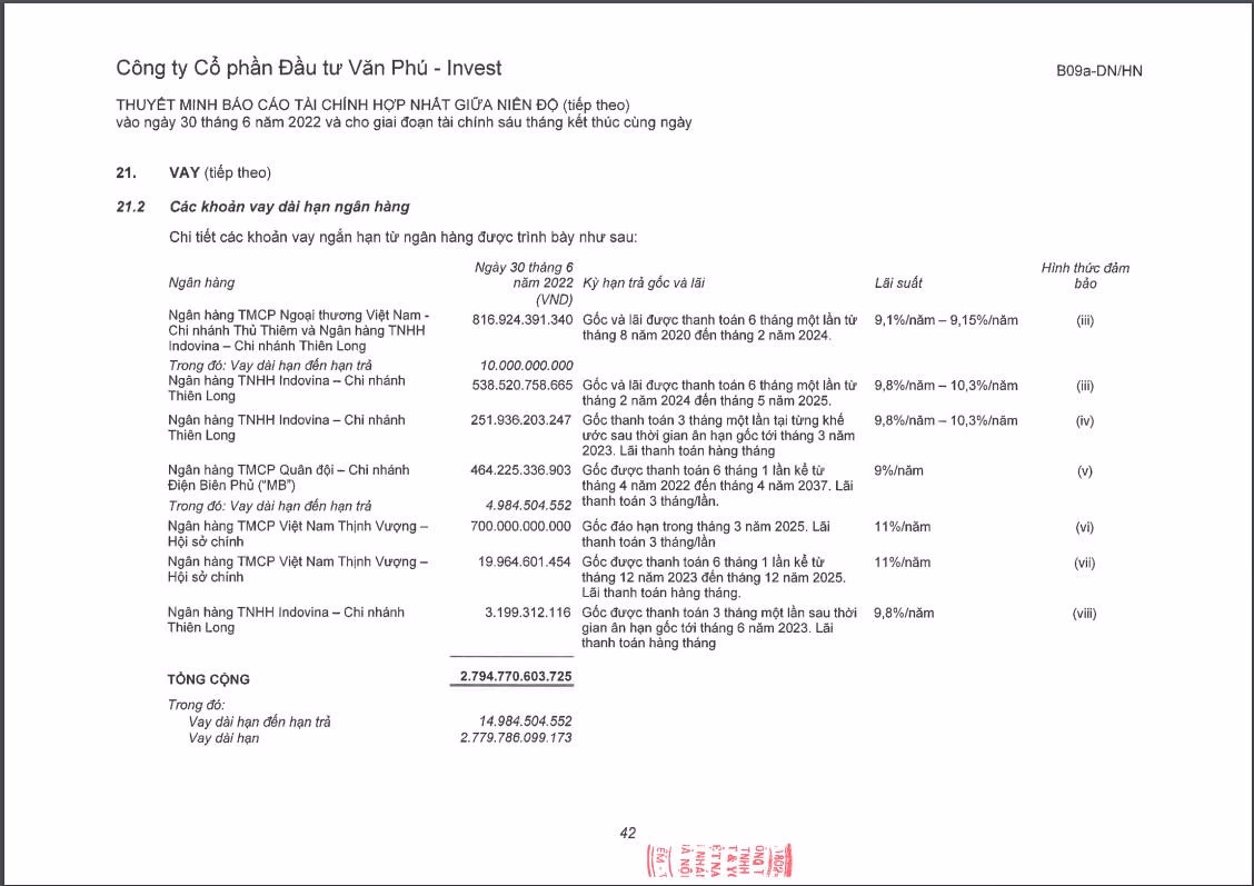Về nguồn vốn, Văn Phú - Invest ghi nhận hơn 7.254 tỷ đồng nợ phải trả, tăng 13% so với đầu năm. Văn Phú - Invest có xu hướng giảm vay nợ ngắn hạn và gia tăng vay nợ dài hạn. Cụ thể, giá trị khoản vay và nợ thuê tài chính ngắn hạn chỉ đạt 495,5 tỷ đồng tại cuối quý II/2022, còn giá trị khoản vay và nợ thuê tài chính dài hạn đạt 3.991,8 tỷ đồng.