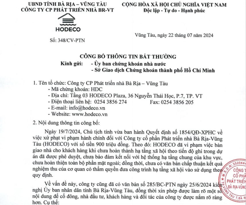 Mới đây, UBND tỉnh Bà Rịa - Vũng Tàu ban hành quyết định về việc xử phạt vi phạm hành chính đối với Công ty cổ phần Phát triển nhà Bà Rịa - Vũng Tàu (Hodeco) với số tiền 900 triệu đồng.
