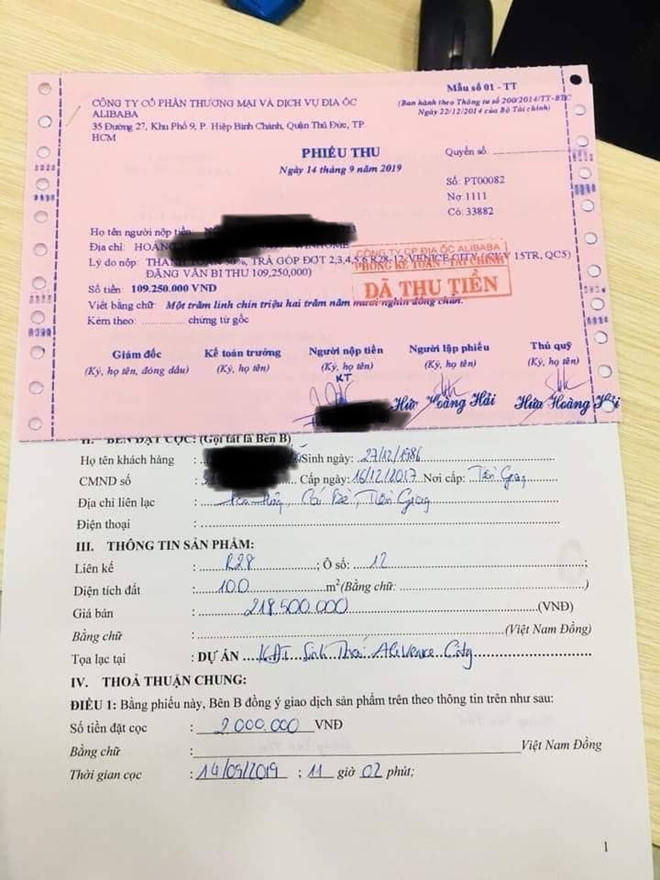 Trên phiếu thu do Công ty cổ phần thương mại - dịch vụ địa ốc Alibaba lập lại có đóng dấu của Công ty cổ phần Địa ốc Alibaba “Đã Thu tiền”