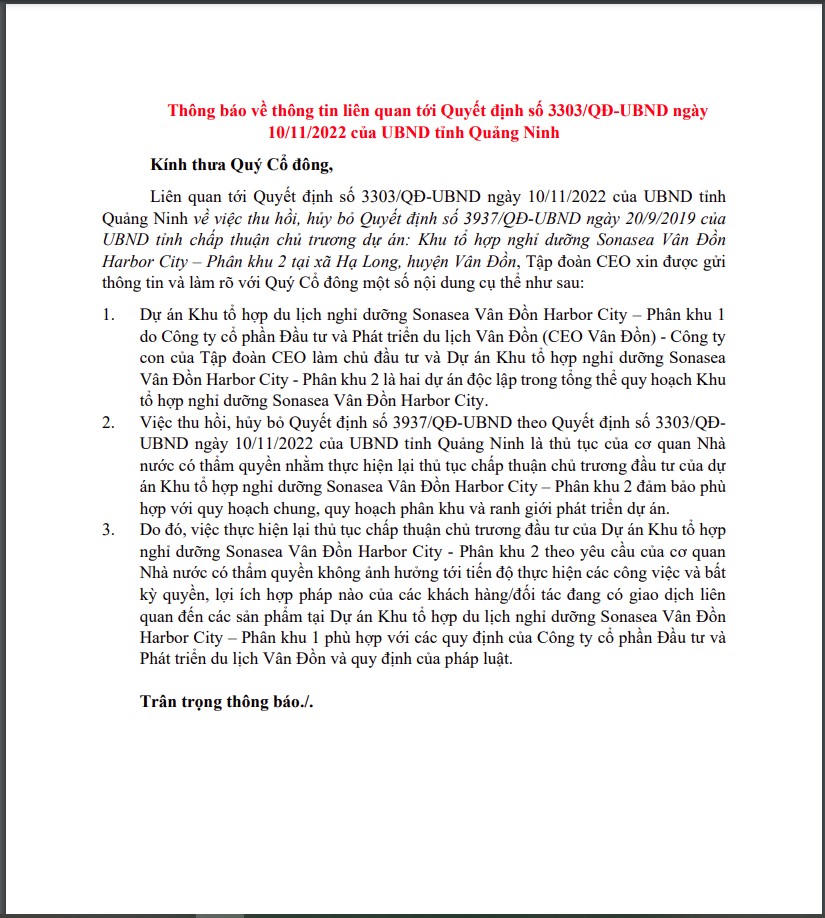 Việc Tập đoàn CEO đưa ra thông báo này trong bối cảnh trước đó, UBND tỉnh Quảng Ninh đã có quyết định về việc thu hồi, hủy bỏ Quyết định chấp thuận chủ trương đầu tư đối với dự án Khu tổ hợp nghỉ dưỡng Sonasea Vân Đồn Harbor City – Phân khu 2 tại xã Hạ Long, huyện Vân Đồn.