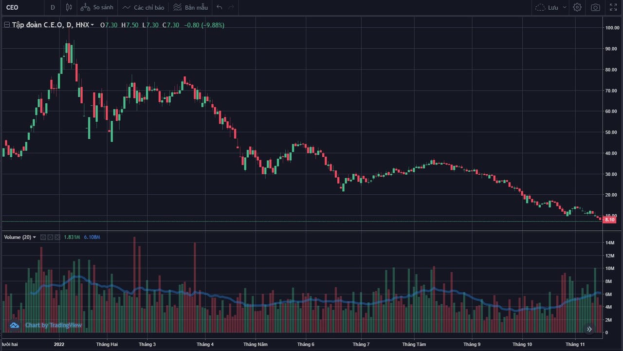 Cụ thể, kể từ khi lập đỉnh với mức giá 92.500 đồng/cổ phiếu hồi đầu năm, cổ phiếu CEO liên tục lao dốc. Kết thúc phiên giao dịch ngày 15/11/2022, cổ phiếu CEO "nằm sàn" chỉ còn 8.100 đồng/cổ phiếu.