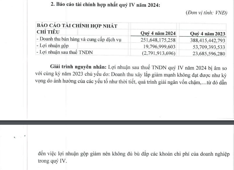 Theo lý giải của doanh nghiệp, lợi nhuận quý IV/2024 bị âm so với cùng kỳ năm 2023 chủ yếu do doanh thu xây lắp giảm mạnh không đạt được như kỳ vọng do ảnh hưởng của các yếu tố như: thời tiết, quá trình giải ngân vốn chậm… Từ đó dẫn đến việc lợi nhuận gộp giảm nên không đủ bù đắp các khoản chi phí của doanh nghiệp trong quý IV.