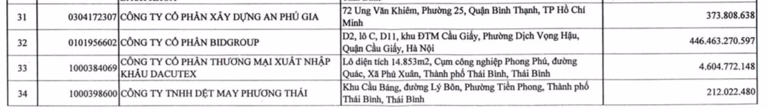 Theo danh sách công khai của Cục Thuế tỉnh Thái Bình, Công ty cổ phần BIDGroup có địa chỉ tại quận Cầu Giấy, Hà Nội nợ số tiền thuế hơn 446,4 tỷ đồng.