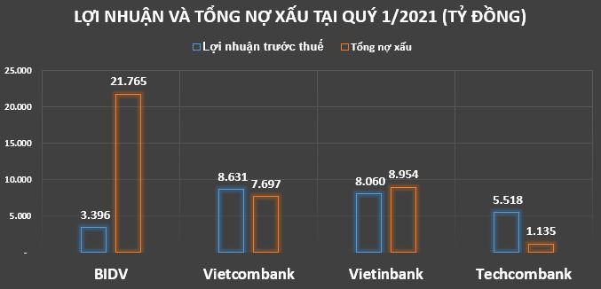 Tính đến 31/3/2021, BIDV tiếp tục giữ vị trí quán quân nợ xấu với 21.765 tỷ đồng, tăng 15,5% so với cuối năm trước.