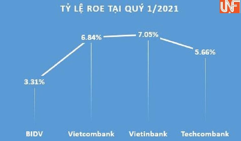 Quý 1/2021, hiệu quả kinh doanh với tỷ lệ lợi nhuận ròng trên vốn sở hữu bình quân (ROE) tại BIDV đạt 3,31% trong khi quý 1/2020 chỉ đạt 1,81%. Tuy nhiên, ROE tại Vietinbank đạt 7,05%; Vietcombank đạt 6,84%; Techcombank đạt 5,66%.