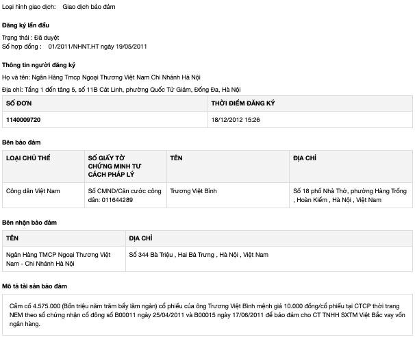Cũng tháng 12/2012 ông Trương Việt Bình còn dùng hơn 3,1 triệu cổ phần tại CTCP Thời trang NEM làm tài sản đảm bảo cho CTCP SX&TM Việt Lý vay vốn ngân hàng tại Vietcombank chi nhánh Hà Nội.