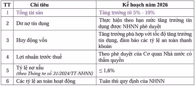 Mục tiêu tổng tài sản tăng 5 - 10%, dư nợ tín dụng được thực hiện theo hạn mức tăng trưởng tín dụng được NHNN phê duyệt, tăng trưởng huy động vốn phù hợp với tốc độ tăng trưởng tín dụng, đảm bảo các tỷ lệ an toàn thanh khoản.