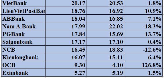 Theo số liệu thống kế, năm 2020 có một số ngân hàng giảm mức thu nhập nhân viên như Vietcombank giảm 6% từ 38,13 triệu đồng/người/tháng năm 2019 xuống 35,73 triệu đồng/người/tháng; Nam A Bank giảm 18,3% từ 22,02 triệu đồng/người/tháng xuống còn 17,99 triệu đồng/người/tháng; NVB giảm 12,6% từ 18,83 triệu đồng/người/tháng xuống còn 16,45 triệu đồng/người/tháng;...