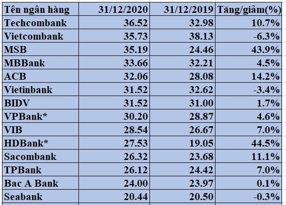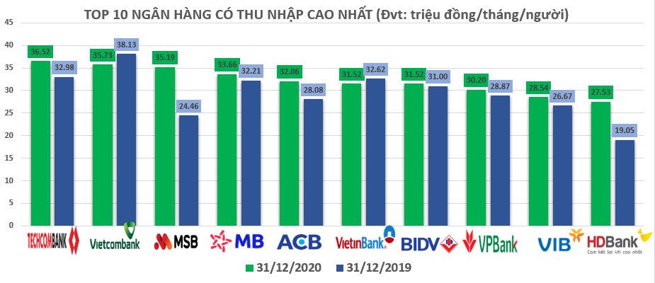 Con số thu nhập bình quân trên báo cáo tài chính của các ngân hàng có thể không phản ánh chính xác thu nhập của riêng từng "banker", nhưng phần nào cho thấy bức tranh hoạt động chung của từng nhà băng trong năm 2020.