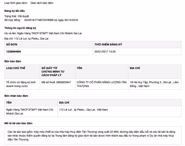 Thông tin trên bảng đăng ký tài sản đảm bảo của Năng lượng Tân Thượng cũng ghi nhận rõ: Tài sản gồm cả các tài sản là “động sản khác thuộc thẩm quyền đăng ký tại Trung tâm đăng ký tài sản được hình thành sau đầu tư trong phạm vi dự án Nhà máy thuỷ điện Tân Thượng”.