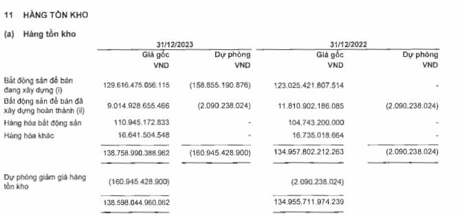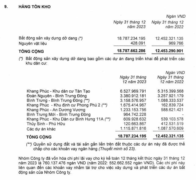 Giá trị hàng tồn kho phần lớn là chi phí sản xuất kinh doanh dở dang tại khu đô thị mới Nam Vĩnh Yên, khu đô thị du lịch sinh thái Đại Phước, khu dân cư P4 Hậu Giang, khu du lịch Long Tân, Nhơn Trạch, khu nhà ở Lam Hạ Center Point…