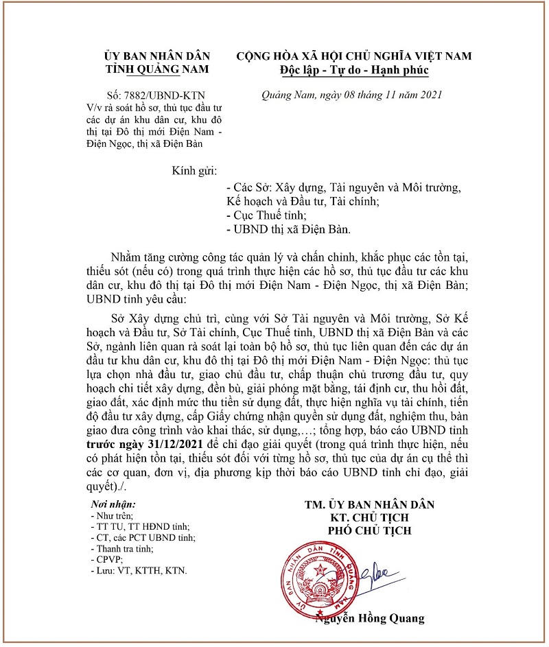 Văn bản nêu rõ, UBND tỉnh Quảng Nam giao Sở Xây dựng chủ trì, cùng với Sở Tài nguyên và Môi trường, Sở Kế hoạch và Đầu tư, Sở Tài chính, Cục Thuế tỉnh, UBND thị xã Điện Bàn và các Sở, ngành liên quan rà soát lại toàn bộ hồ sơ, thủ tục liên quan đến các dự án khu dân cư, khu đô thị tại Đô thị mới Điện Nam – Điện Ngọc.