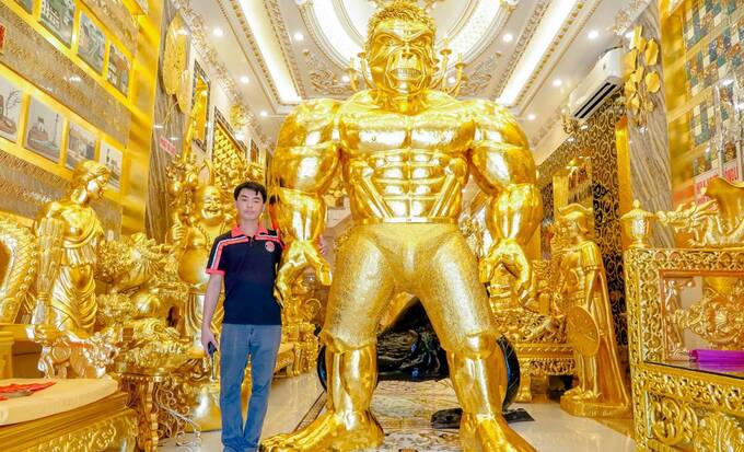 Đây cũng là đồ vật gây chú ý mạnh mẽ khi người tham quan bước chân vào căn nhà dát vàng. Ở 2 bên, người tham quan sẽ dễ nhận thấy sự xuất hiện của Phật Di Lặc, chiến binh Hy Lạp, ghế, cây... đều được dát vàng kỹ lưỡng, công phu. Anh Trung chủ nhà dát vàng thậm chí còn có hẳn 1 xưởng chuyên đúc tượng cũng như các sản phẩm trưng bày khác. Sau khi có khuôn và dát vàng cẩn thận, những hiện vật này mới được vận chuyển tới để trưng bày.