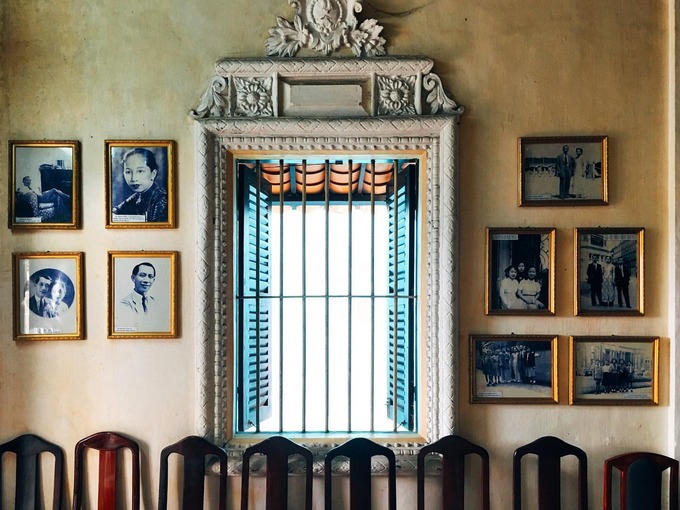 Bên trong nhà có nhiều nội thất, gạch bông và kính màu được nhập từ Pháp. Đặc biệt, phần cửa kính màu được thiết kế tinh xảo, tạo nên những mảng màu rất nghệ thuật dưới ánh nắng. Những đồ dùng trong nhà như tủ rượu, giá sách, tivi trắng đen hay những bộ bình trà, đèn, máy hát vẫn còn được lưu giữ, đều có tuổi đời trên 130 năm.