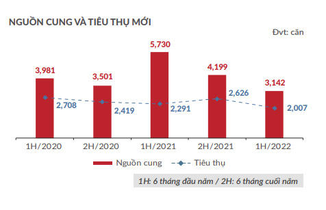 Trong 6 tháng đầu năm 2022, thị trường TP.HCM và các vùng phụ cận ghi nhận cung cấp ra thị trường khoảng 3,142 căn, bằng 55% so với 6 tháng đầu năm 2021 (5,730 căn). Đồng thời, tỷ lệ tiêu thụ xấp xỉ 88% so với cùng kì 2021 (2,291 căn) và xấp xỉ 64% nguồn cung mở bán, tương đướng 2,007 căn.