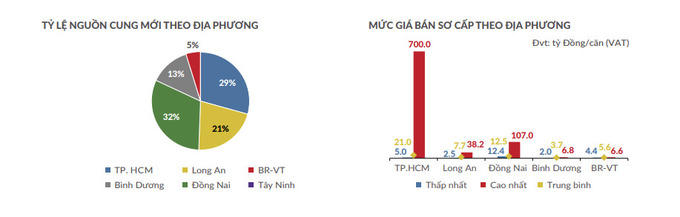 Giá bán sơ cấp ngày càng tăng, thị trường TP.HCM thiết lập mặt bằng giá mới với mức giá bán lên đến 700 tỷ đồng/căn. Đồng Nai ghi nhận giá bán cao nhất lên đến 107 tỷ đồng/căn. Long An ghi nhận giá cao nhất là 38.2 tỷ đồng. Bình Dương và Bà Rịa – Vũng Tàu ghi nhận mức giá cao nhất lần lượt là 6.8 tỷ đồng và 6.6 tỷ đồng.