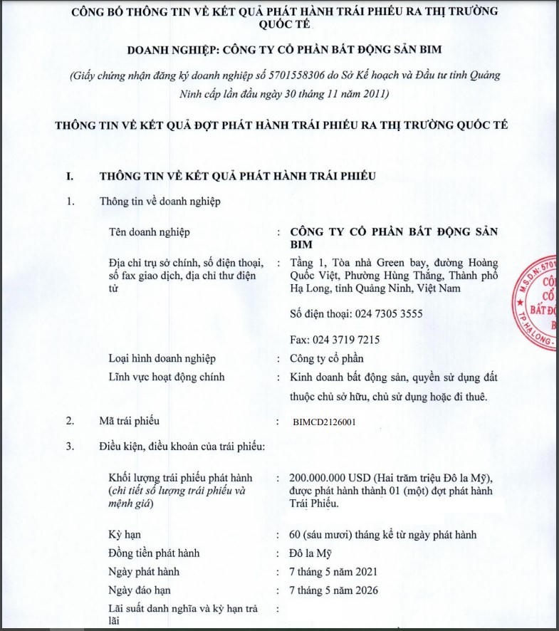 Lô trái phiếu đang được nhắc đến có mã BIMCD2126001, tổng giá trị 200 triệu USD (khoảng 4.600 tỷ đồng), được phát hành vào ngày 7/5/2021 có kỳ hạn 60 tháng, đáo hạn vào ngày 7/5/2026.
