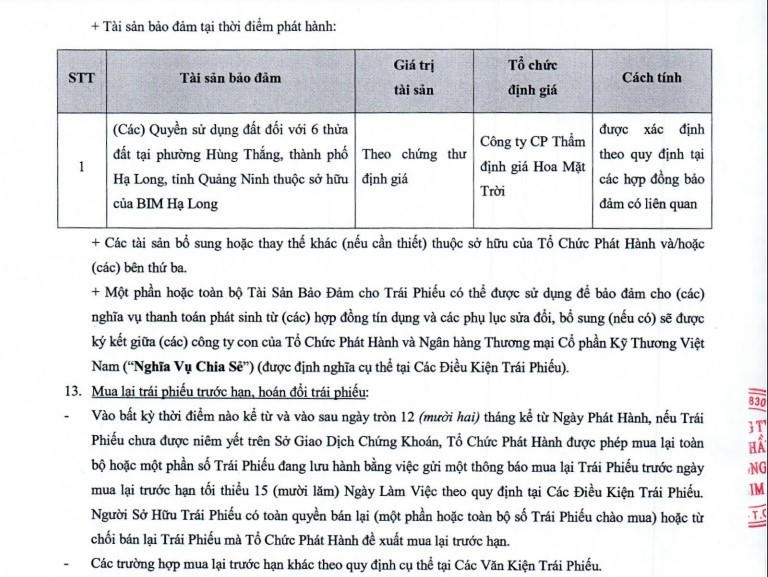 Tài sản đảm bảo của lô trái phiếu là 6 quyền sử dụng đất với các thửa đất tại phường Hùng Thắng, thành phố Hạ Long, tỉnh Quảng Ninh. Giá trị tài sản được định giá bởi CTCP Thẩm định giá Hoa Mặt Trời.