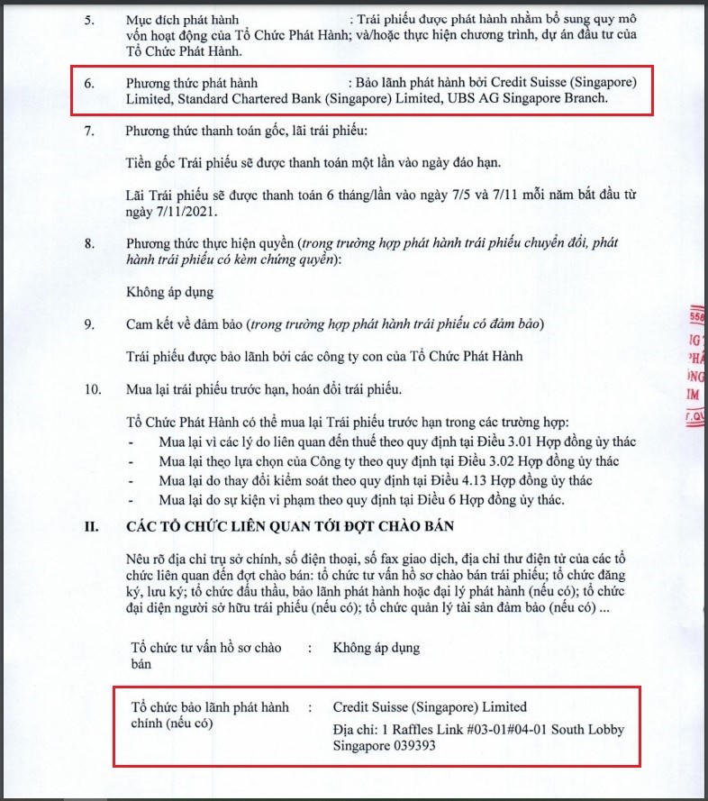 Đáng chú ý, các ngân hàng tư vấn, thu xếp phát hành là ngân hàng đầu tư Credit Suisse, Standard Chartered Bank và UBS. Ngân hàng Credit Suisse và UBS tư vấn về vấn đề xếp hạng tín nhiệm doanh nghiêp và ngân hàng Standard Chartered tư vấn về vấn đề trái phiếu xanh.