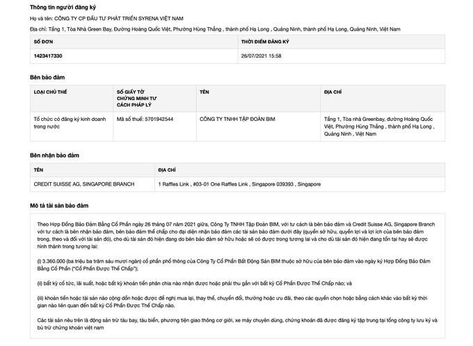 Thông tin giao dịch đảm bảo của BIM Land không có, tuy vậy BIM Group – công ty mẹ của BIM Land - lại có nhiều thông tin giao dịch đảm bảo. Liên quan đến Credit Suisse, thông tin giao dịch đảm bảo ghi nhận tháng 7/2021 có một giao dịch đảm bảo. Bên đăng ký thông tin là CTCP Đầu tư Phát triển Syrena Việt Nam, bên đảm bảo là Công ty TNHH Tập đoàn BIM (BIM Group) và bên nhận đảm bảo là Credit Suisse AG, Singapore Branch.