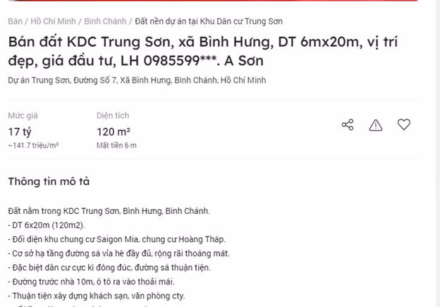 Ở thời điểm hiện tại, 1 nền đất ở khu dân cư (KDC) Trung Sơn có giá từ 125-160 triệu đồng/m2. Lý giải giá đất đắt đỏ, một môi giới cho hay, từ khu dân cư Trung Sơn, Bình Chánh, cư dân có thể kết nối tới địa bàn quận 1 qua các kênh Cầu Tẻ hay quận 2 bằng cầu Phú Mỹ. Bên cạnh đó, để đến được Nhà Bè, quận 5 và quận 10 cũng khá dễ dàng.
