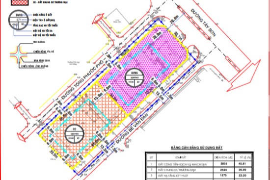 Theo đó, khu đất có diện tích hơn 7.000m2, trong đó đất ở để xây dựng nhà ở chung cư hỗn hợp 6.300m2, đất giao thông - hạ tầng kỹ thuật 786m2.