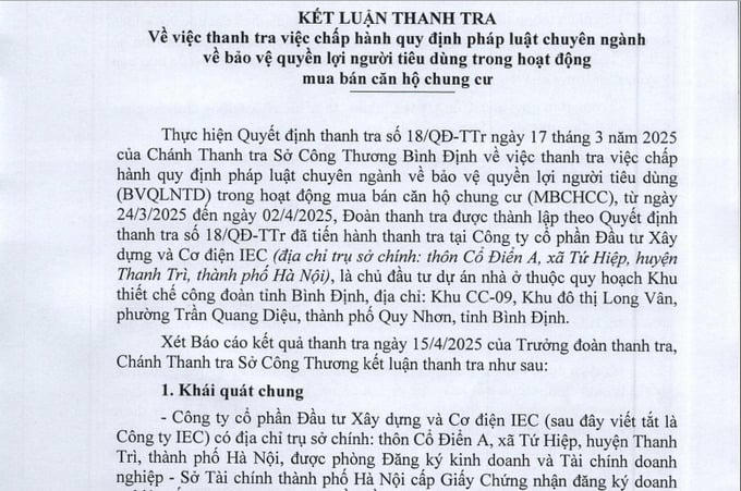 Thanh tra Sở Công Thương tỉnh Bình Định đã công khai kết luận thanh tra việc chấp hành quy định pháp luật chuyên ngành về bảo vệ quyền lợi người tiêu dùng trong hoạt động mua bán căn hộ chung cư từ ngày 24/3/2025 đến ngày 2/4/2025.