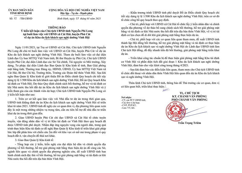Mới đây văn phòng UBND tỉnh Bình Định vừa ban hành Thông báo ý kiến Kết luận của Chủ tịch UBND tỉnh Nguyễn Phi Long về việc dự án Khu du lịch khách sạn nghỉ dưỡng Vĩnh Hội sẽ tái triển khai từ năm 2021.