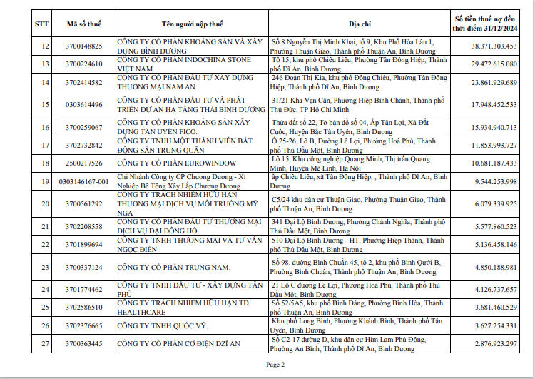 Đứng thứ hai trong danh sách là Công ty TNHH xây dựng Bất động sản Hà An, địa chỉ đường Kha Vạn Chân, phường An Bình, TP Dĩ An có số nợ hơn 128,1 tỷ đồng. Đứng thứ ba là Công ty cổ phần Đầu tư kinh doanh bất động sản Hưng Phát, địa chỉ khu phố Trung, phường Vĩnh Phú, TP Thuận An, có số nợ hơn 81 tỷ đồng