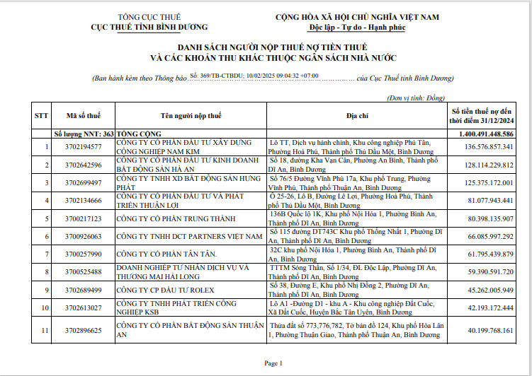 Cục Thuế tỉnh Bình Dương vừa công khai danh sách người nộp thuế nợ tiền thuế và các khoản thu khác thuộc ngân sách nhà nước. Cụ thể, có tổng cộng 363 người nộp thuế còn nợ tiền thuế theo thông báo ngày 10/2/2025.