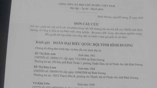 Điều đáng nói, bà Loan và bà Liên khẳng định không biết diện tích đất của họ có bị thu hồi hay không. Cụ thể, trong suốt quá trình thực hiện thu hồi đất, Công ty Becamex IDC Corp đã không sử dụng để xây dựng khu dân cư Viet Sing đến phần đất của hộ gia đình nhà các bà. Trong quá trình đi làm thủ tục để xin cấp lại Giấy chứng nhận quyền sử dụng đất đối với phần đất của hộ gia đình, bà Loan, bà Anh và bà Liên mới được các cấp chính quyền của TP.Thuận An, Sở Tài nguyên và Môi trường tỉnh Bình Dương thông báo bằng văn bản cho biết, thửa đất đứng tên hộ gia đình bà Bồ Thị Thu và bà Võ Kim Liên đã bị UBND tỉnh Bình Dương thu hồi (theo Quyết định số 658/QĐ-CT và Quyết định số 1624/QĐ-CT nêu trên) và Giấy CNQSDĐ đứng tên bà Bồ Thị Thu, Võ Kim Liên cũng đã bị thu hồi.