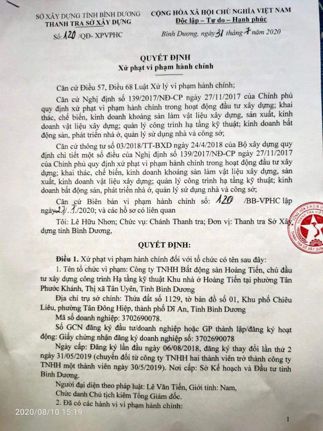 Trên địa bàn Tân Uyên, Thanh tra Sở Xây dựng tỉnh Bình Dương đã ban hành quyết định xử phạt hành chính 40 triệu đồng đối với Công ty Cổ phần Bất động sản Hoàng Tiến vì tổ chức thi công xây dựng khi không có giấy phép xây dựng tại dự án khu nhà ở Hoàng Tiến Central.