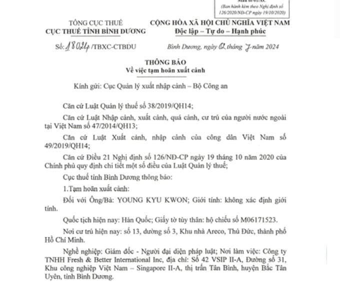 Cùng ngày, Cục Thuế tỉnh Bình Dương đã ban hành Thông báo số 18024/THXC-CTBDU về việc tạm hoãn xuất cảnh đối với Young Kyu Kwon, Quốc tịch Hàn Quốc là Giám đốc kiêm đại diện pháp luật Công ty TNHH Fresh& Better Intermation inc, địa chỉ tại số 42, Vsip II-A , Đường số 31, Khu công nghiệp Việt Nam – Singapore II-A, thị trấn Tân Định, huyện Bắc Tân Uyên, tỉnh Bình Dương.