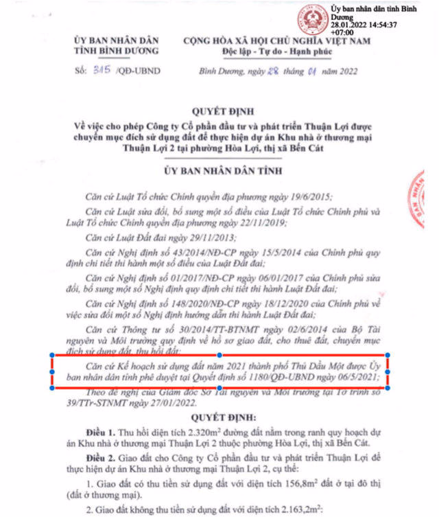 Cụ thể, tại Quyết định số 315/QĐ-UBND về việc cho phép Công ty cổ phần Đầu tư và Phát triển Thuận Lợi được chuyển đổi mục đích sử dụng đất để thực hiện dự án Khu nhà ở thương mại Thuận Lợi 2 tại phường Hòa Lợi, thị xã Bến Cát. Quyết định này do ông Mai Hùng Dũng, Phó Chủ tịch Thường trực UBND tỉnh Bình Dương ký ngày 28/1/2022. Nhưng căn cứ Kế hoạch sử dụng đất năm 2021 của Tp.Thủ Dầu Một được UBND tỉnh phê duyệt tại Quyết định số 1180/QĐ-UBND ngày 06/5/2021” để cấp cho cho Công ty Thuận Lợi chuyển đổi mục đích sử dụng đất ở thị xã Bến Cát nhằm thực hiện dự án.