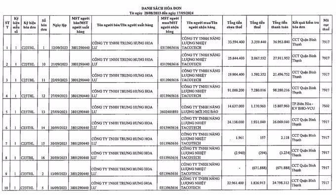 Công ty Trung Hưng Hoa Lư có xuất hóa đơn bán hàng, có doanh thu mua vào và thuế trên hóa đơn điện tử nhưng không kê khai với cơ quan thuế. Từ những dấu hiệu này ngành Thuế tỉnh Bình Phước đã phát đi cảnh báo có rủi ro cao về thuế và hóa đơn.