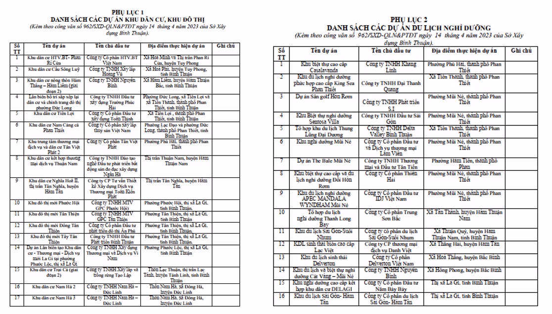 Theo danh sách Sở Xây dựng Bình Thuận cung cấp công khai, có 17 dự án kinh doanh khu dân cư, khu đô thị và 16 dự án du lịch nghỉ dưỡng ở Bình Thuận chưa đủ điều kiện đưa vào giao dịch, kinh doanh. Trong đó có các dự án lớn ở Mũi Né, TP Phan Thiết, thời gian qua rao bán, đặt chỗ, giữ chỗ tràn lan trên các nền tảng mạng xã hội.