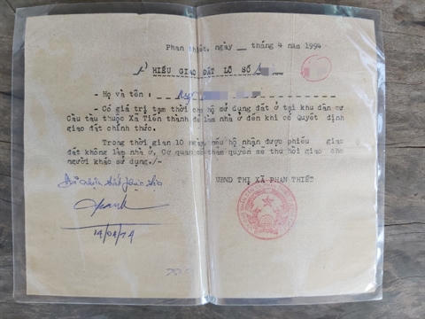 | Trong lần tái định cư năm 1994, mỗi hộ dân được nhận một phiếu giao đất như thế này |