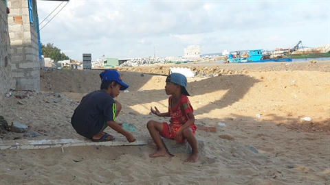 | Hiền (áo đen) cùng bạn chơi ở bãi cát khi không được đi học, phía xa là dự án Hamubay Phan Thiết đang được xây dựng |