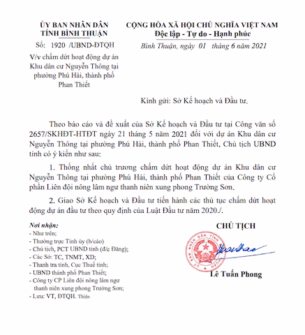 Chủ tịch UBND tỉnh Bình Thuận Lê Tuấn Phong vừa ký văn bản gởi Sở Kế hoạch và Đầu tư thống nhất chủ trương chấm dứt hoạt động dự án Khu dân cư Nguyễn Thông ở phường Phú Hài, TP Phan Thiết do Công ty Cổ phần Liên đội nông lâm ngư thanh niên xung phong Trường Sơn làm chủ đầu tư.
