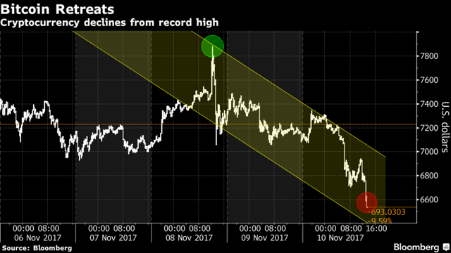 Như vậy từ đỉnh gần 8.000 USD, bitcoin giảm hơn 1.000 USD trong chưa đầy 48 giờ.