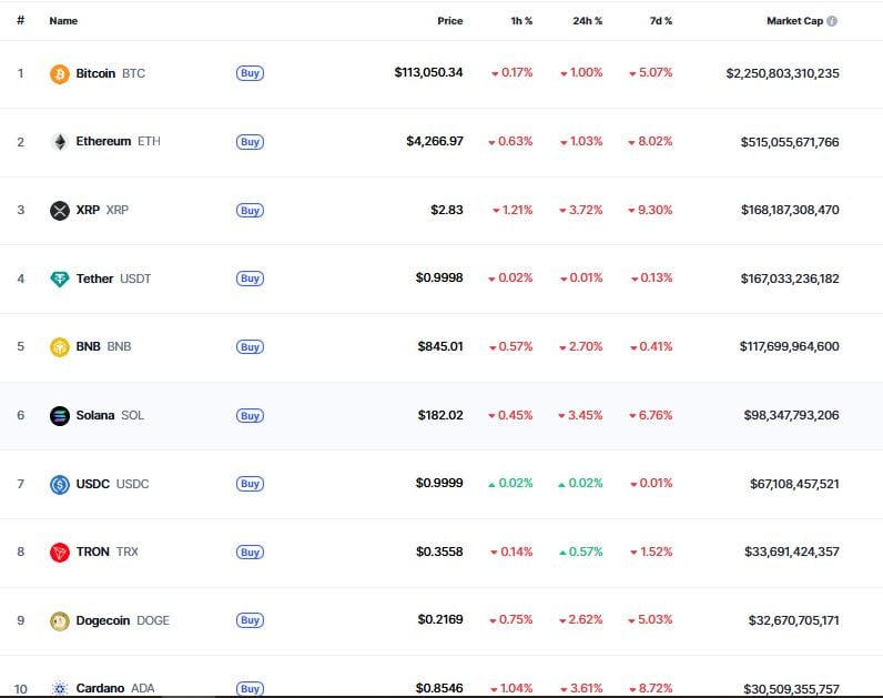 Vào thời điểm 10h30 ngày 22/8 (theo giờ Việt Nam), giá Bitcoin theo ghi nhận của CoinMarketCap đang giao dịch ở mức 113.050 USD, giảm 5,07% so với 7 ngày trước.