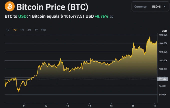 Thị trường vừa chứng kiến giá bitcoin vọt lên mức cao nhất 107.780 USD/BTC trước khi lùi nhẹ xuống và được giao dịch quanh mốc 106.500 USD.