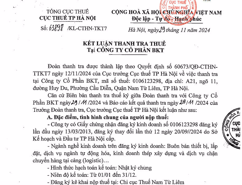 Cục thuế TP Hà Nội vừa có kết luận thanh tra thuế tại Công ty cổ phần BKT, địa chỉ đường Huy Du, phường Cầu Diễn, quận Nam Từ Liêm, Hà Nội.
