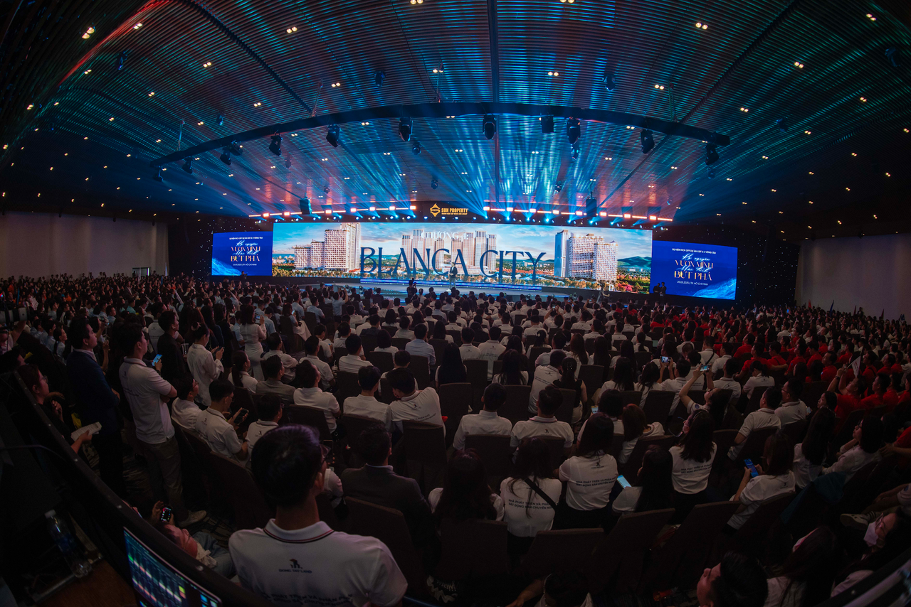 Ngay sáng sớm, hàng nghìn chuyên viên kinh doanh đã có mặt, khuấy động không khí với tinh thần nhiệt huyết. Khán phòng như vỡ òa trong tiếng hô đồng thanh, cờ hoa rạo rực, sẵn sàng bước vào hành trình chinh phục và trao giá trị cho các khách hàng Blanca City.