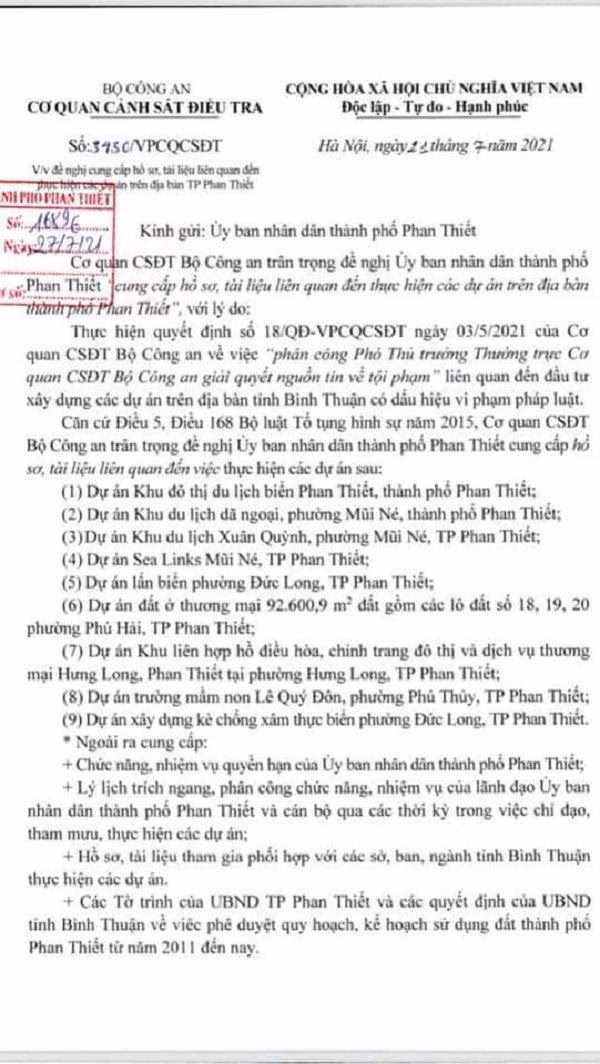 Cơ quan Cảnh sát điều tra (CSĐT) Bộ Công an vừa có văn bản số 3430/VPCQCSĐT gửi UBND TP Phan Thiết (tỉnh Bình Thuận) về việc cung cấp hồ sơ, tài liệu liên quan đến việc thực hiện 9 dự án trên địa bàn thành phố.