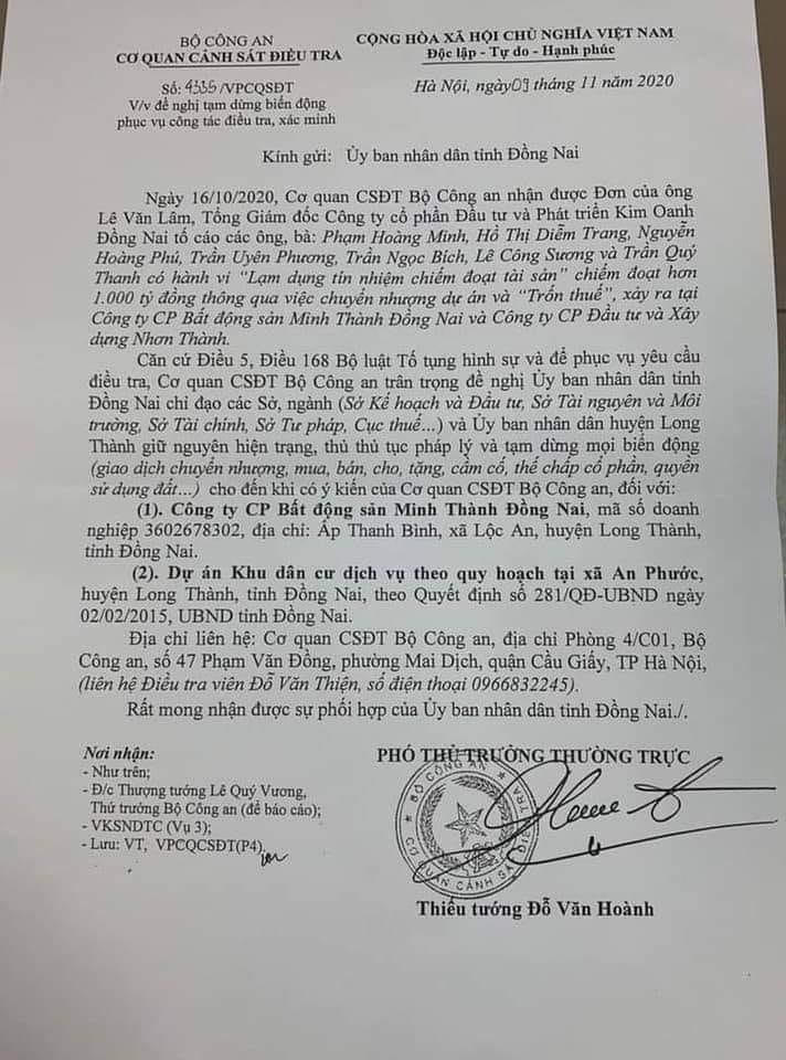 Để phục vụ yêu cầu điều tra, Cơ quan Cảnh sát điều tra Bộ Công an đề nghị UBND tỉnh Đồng Nai chỉ đạo các Sở, ngành (Sở Kế hoạch và Đầu tư, Sở Tài nguyên và Môi trường, Sở Tài chính, Sở Tư pháp, Cục thuế…) và UBND huyện Long Thành giữ nguyên hiện trạng, thủ tục pháp lý và tạm dừng mọi biến động (giao dịch chuyển nhượng, mua, bán, cho, tặng, cầm cố, thế chấp cổ phần, quyền sử dụng đất…) cho đến khi có ý kiến của Cơ quan Cảnh sát điều tra Bộ Công an đối với: Công ty Cổ phần Bất động sản Minh Thành Đồng Nai (trụ sở: ấp Thanh Bình, xã Lộc An, huyện Long Thành, tỉnh Đồng Nai) và dự án Khu dân cư dịch vụ theo quy hoạch tại xã An Phước, huyện Long Thành, tỉnh Đồng Nai, theo Quyết định số 281/QĐ-UBND, ngày 2/2/2015, của UBND tỉnh Đồng Nai.