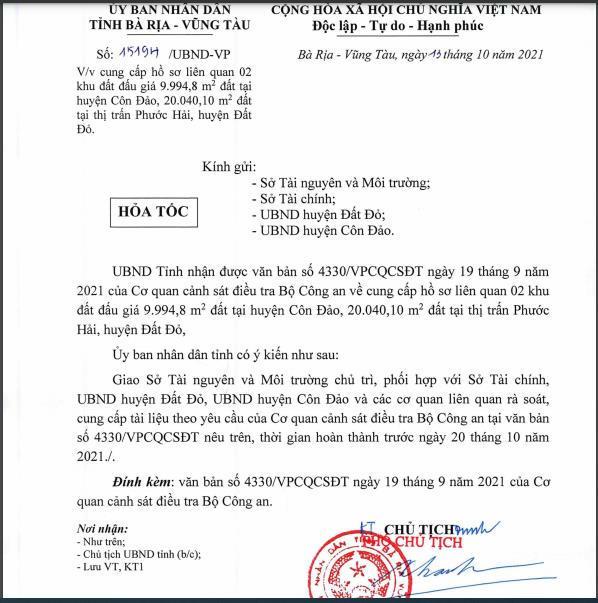 Theo đó, UBND tỉnh Bà Rịa – Vũng Tàu cho biết đã nhận được văn bản của Cơ quan cảnh sát điều tra Bộ Công an yêu cầu cung cấp hồ sơ liên quan 2 khu đất đấu giá tại huyện Côn Đảo và huyện Đất Đỏ.