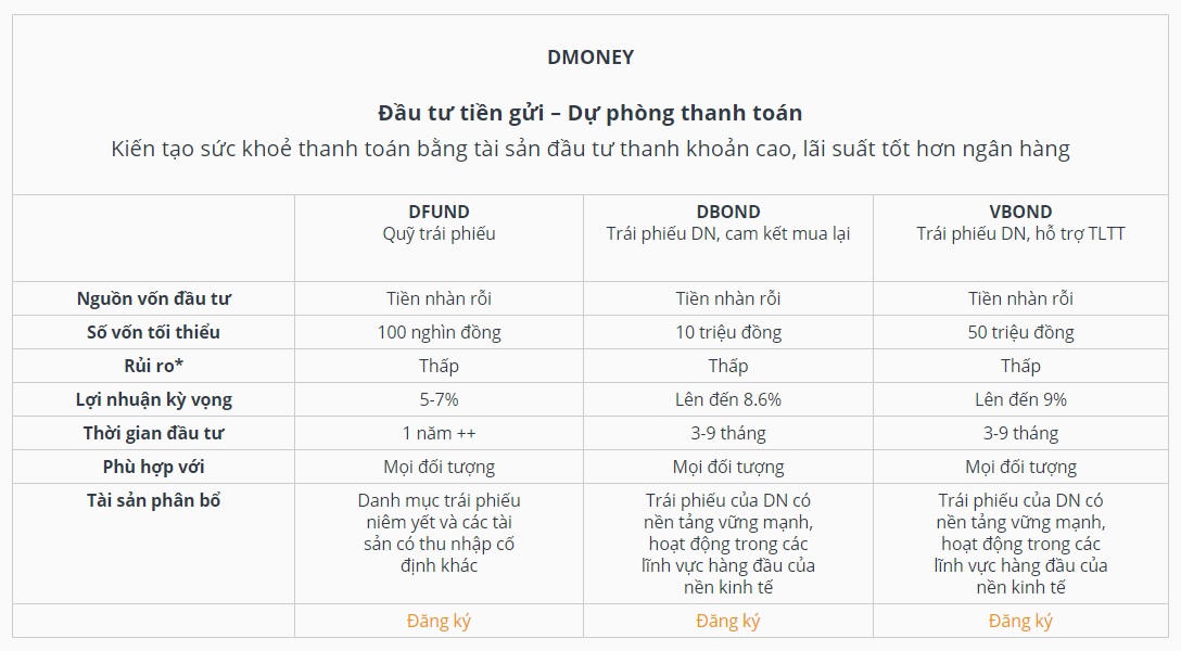 Còn tại VNDirect, công ty này thiết kế sản phẩm DMoney để huy động vốn từ các nhà đầu tư. Kỳ hạn cũng khá đa dạng. Trong đó, lãi suất thấp nhất là tại kỳ hạn 1 tuần với 3,1%/năm, lãi suất cao nhất tại kỳ hạn 360 ngày với 6,5%/năm.