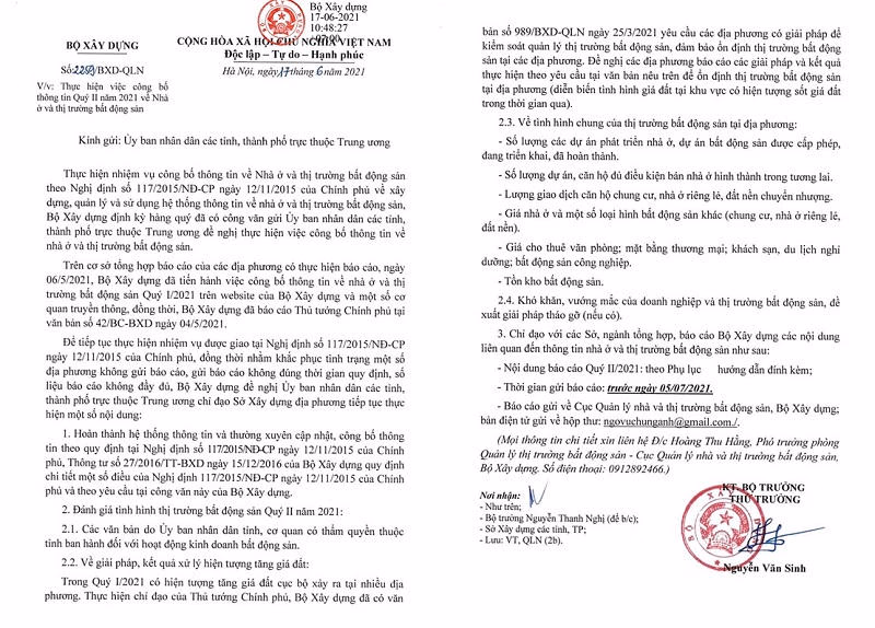 Bộ Xây dựng cũng đề nghị các địa phương báo cáo các giải pháp và kết quả thực hiện để ổn định thị trường bất động sản; trong đó báo cáo cần phản ánh đúng diễn biến tình hình giá đất tại khu vực có hiện tượng sốt giá đất trong thời gian qua.
