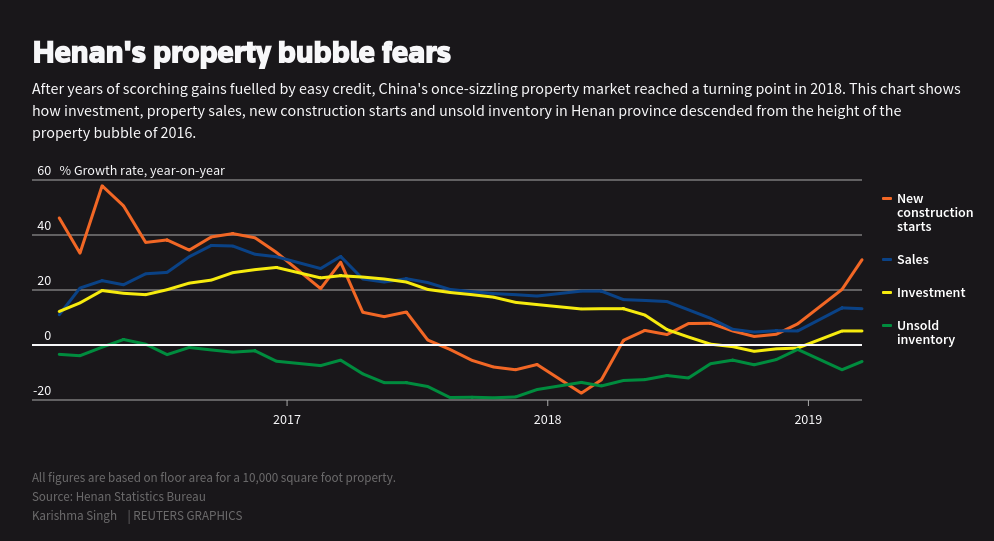 Ở quận Beilonghu cao cấp nhìn ra một hồ nước nhân tạo ở rìa phía bắc của Trịnh Châu, những dãy biệt thự sang trọng được trang trí với những mái nhà dinh thự truyền thống đã có giá hàng chục triệu nhân dân tệ, ngang với giá nhà ở Sydney. Nhưng vào tháng 9 năm ngoái, thị trường bất động sản Trịnh Châu xuống cấp nhanh chóng. Số lượng nhà chưa bán được đã tăng 26,5% trong năm ngoái. Trên toàn quốc, doanh số bán bất động sản theo diện tích sàn tăng 1,3% trong năm 2018 so với một năm trước đó, mặc dù năm trước tăng đến 7,7%. Tại Hà Nam, sự suy giảm còn mạnh mẽ hơn: mức độ tăng trưởng giảm xuống còn 5,1% vào năm ngoái, so với mức 17,8% trong năm 2017. Đầu tư bất động sản của Hà Nam đã giảm lần đầu tiên vào năm 2018.